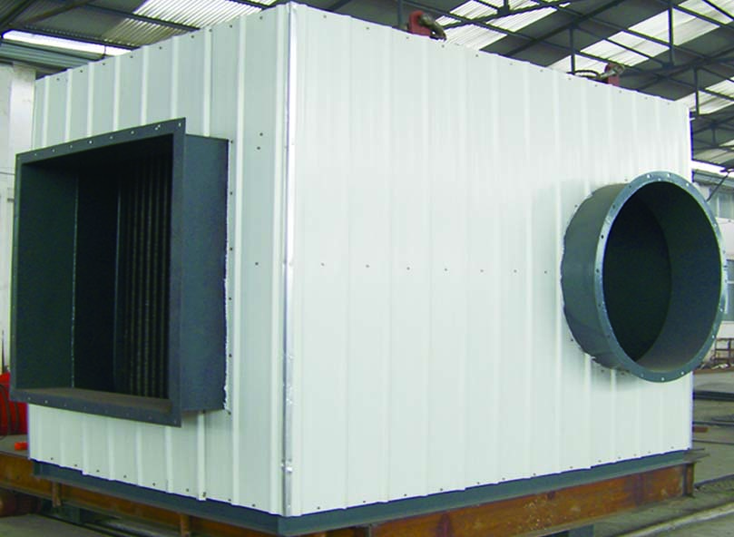 KJQ型礦井空氣加熱器主體結(jié)構(gòu)為空氣加熱器、風(fēng)機(jī)、設(shè)備基座及控制部分構(gòu)成(屬敞開(kāi)式結(jié)構(gòu)),將其安裝在保溫的空間內(nèi)形成一個(gè)箱體式結(jié)構(gòu)。